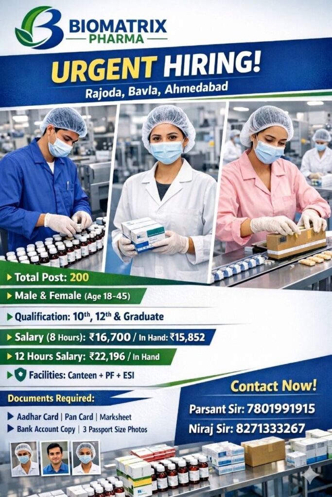 Biomatrix Phama рдХрдВрдкрдиреА рдореЗрдВ рд▓рдбрд╝рдХреА рдФрд░ рд▓рдбрд╝рдХрд┐рдпрд╛рдВ рджреЛрдиреЛрдВ рдХреЗ рд▓рд┐рдП рджрд╡рд╛рдИ рдкреИрдХрд┐рдВрдЧ рд╡реИрдХреЗрдВрд╕реА рдирд┐рдХрд▓ рдХрд░ рдЖрдИ рд╣реИ рд░рд╛рдЬрд╡рд╛рдбрд╝рд╛ рдЕрд╣рдорджрд╛рдмрд╛рдж рдЧреБрдЬрд░рд╛рдд рдХреЗ рдЕрдВрджрд░ рдЕрдЧрд░ рдЖрдк рд▓реЛрдЧ рдХреЗ рдПрдЬреБрдХреЗрд╢рди рдЕрдирдкрдврд╝, рдкрд╛рдВрдЪрд╡реА рдкрд╛рд╕, рдЖрдард╡реАрдВ рдкрд╛рд╕, рджрд╕рд╡реАрдВ рдкрд╛рд╕ рд╣реИ рдФрд░ рджрд╡рд╛рдИ рдкреИрдХрд┐рдВрдЧ рдХрд╛ рдЬреЙрдм рд╕рд░реНрдЪ рдХрд░ рд░рд╣реЗ рддреЛ рдЕрд╣рдорджрд╛рдмрд╛рдж рдореЗрдВ рдЖрдкрдХреА рдбрд╛рдпрд░реЗрдХреНрдЯ рдЬреЙрдЗрдирд┐рдВрдЧ рд╣реЛ рдЬрд╛рдПрдВрдЧреЗ рдиреАрдЪреЗ рджрд┐рдП рдЧрдП рдЬреЙрдм рдЗрдирдлрд╛рд░реНрдореЗрд╢рди рдбрд╛рдпрд░реЗрдХреНрдЯ рдСрдлрд┐рд╕ рдкрд░ Visit рдХрд░реЗрдВ
